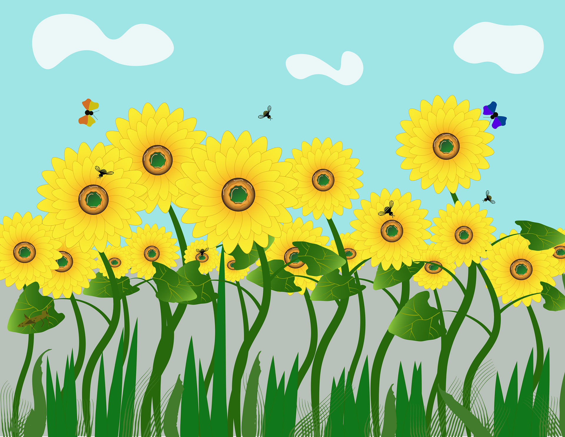 Here is a meadow scene created in Adobe Illustrator. The challenge was to develop it using shapes, textures, and brushes.