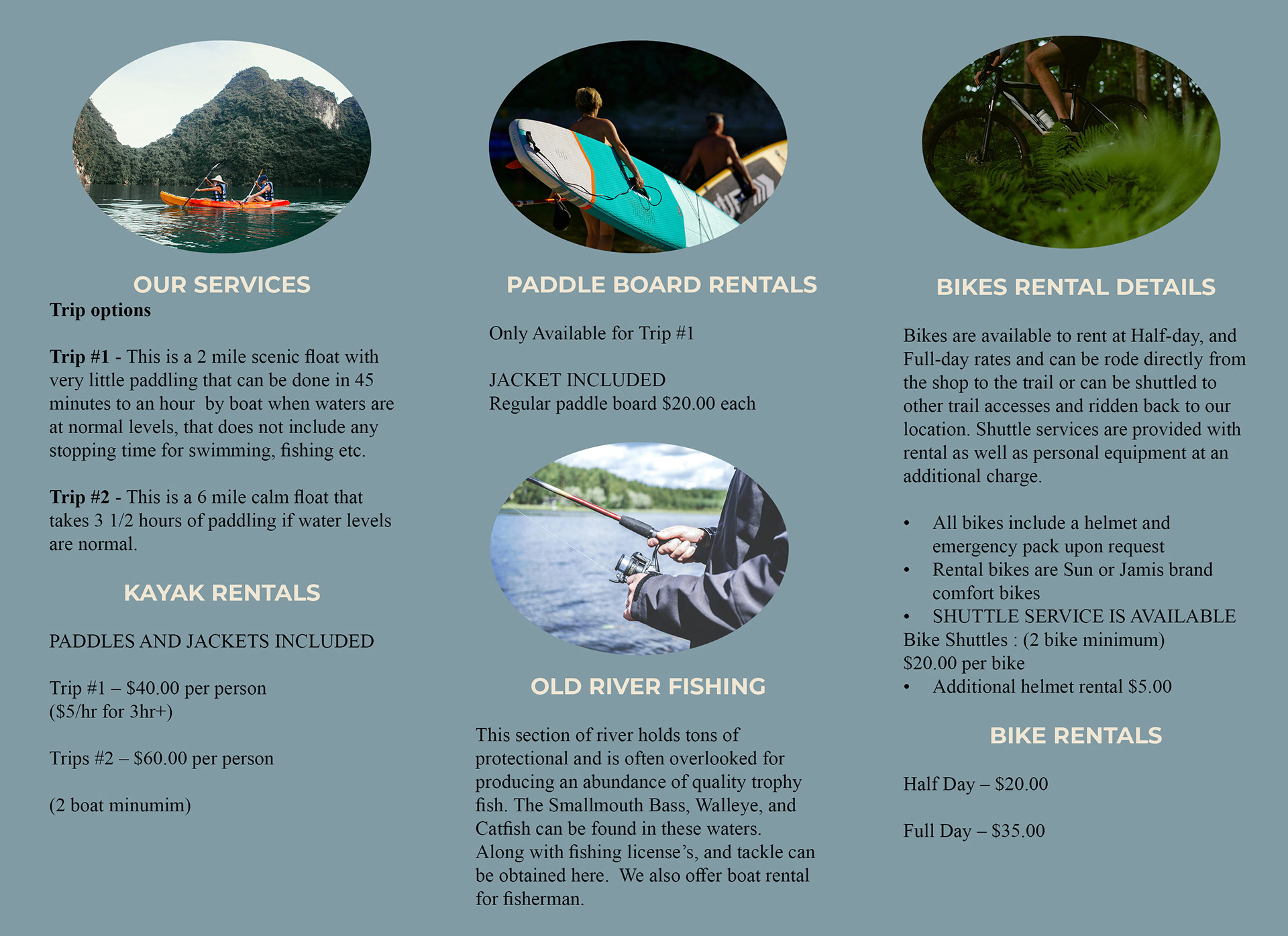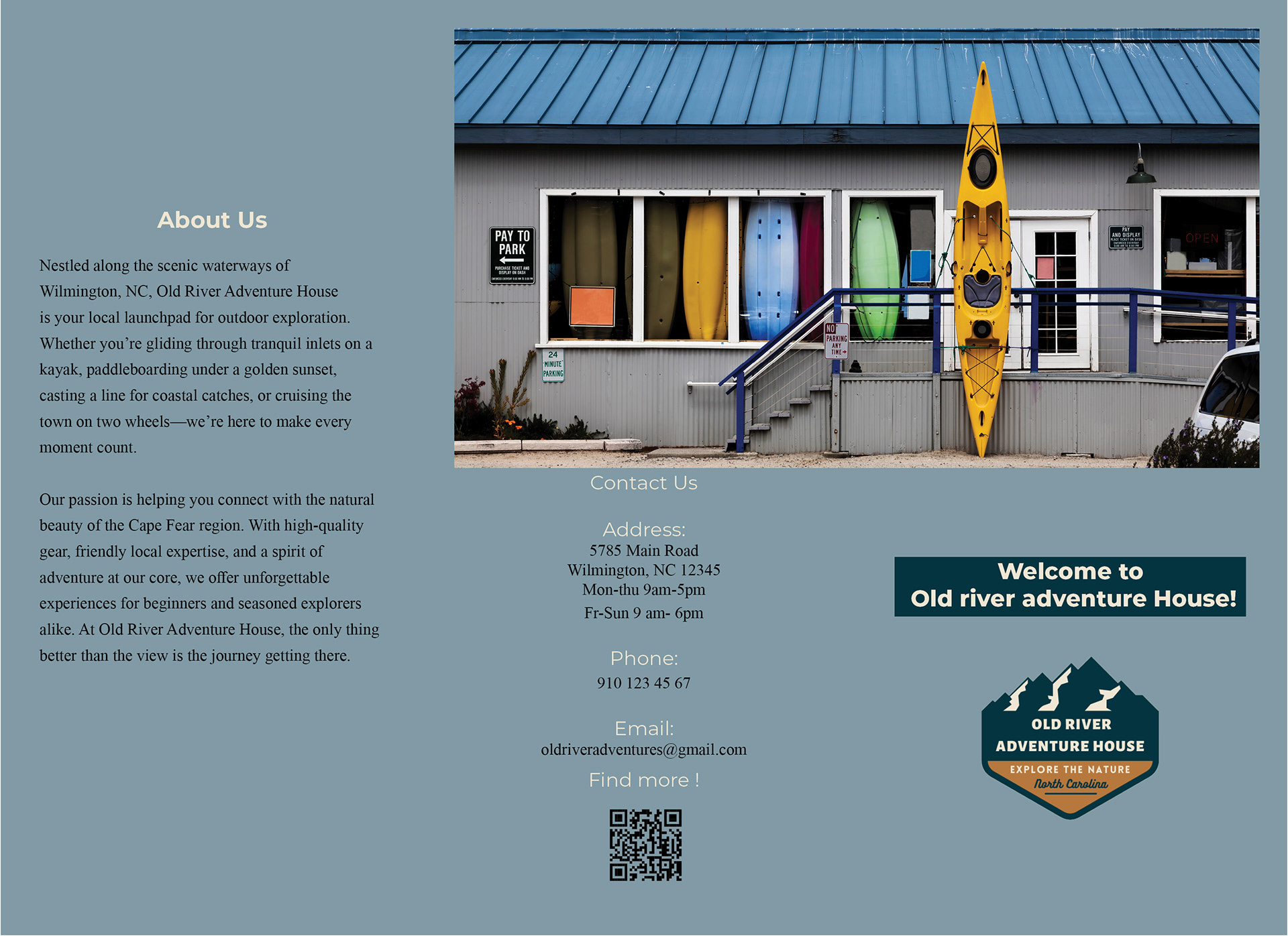 The trifold brochure is created for an imaginary adventure place located on the river. I chose a pastel font and a calm, natural blue color for the background. The brochure gives brief and concise information about what to expect, and also real life pictures demonstrating the experience.